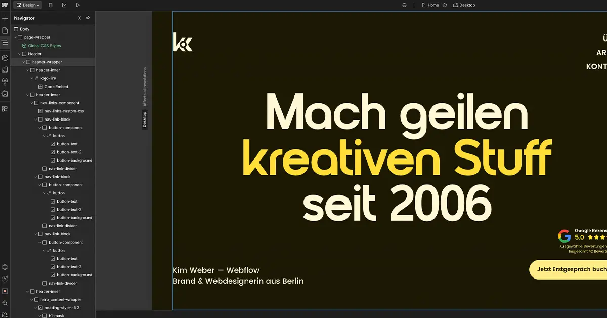 Webflow ist für mich nicht nur ein Tool – es ist mein digitales Zuhause. Ich nutze es, um Visionen sichtbar zu machen, Marken greifbar zu gestalten und Webseiten zu bauen, die nicht nur gut aussehen, sondern fühlen.